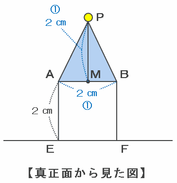 このとき、光源Pと筒の上部にある点A、Bを結ぶと青い二等辺三角形PABができ、高さPMと底辺ABの長さはどちらも2㎝になっています。