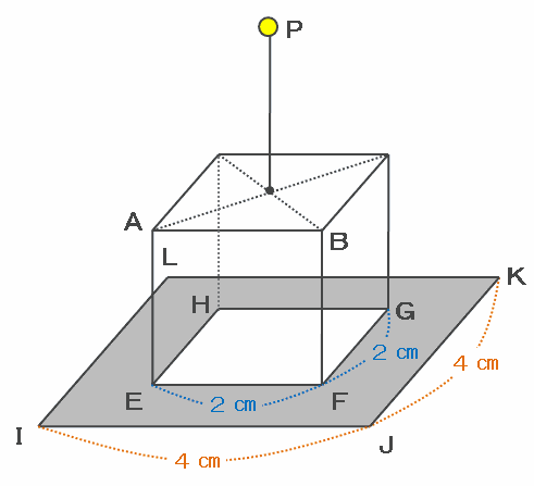 つまり、次の図の正方形IJKLは1辺の長さが4㎝、そして正方形EFGHは1辺の長さが2㎝なので、床にできる影の面積は4×4-2×2=12㎠になります。