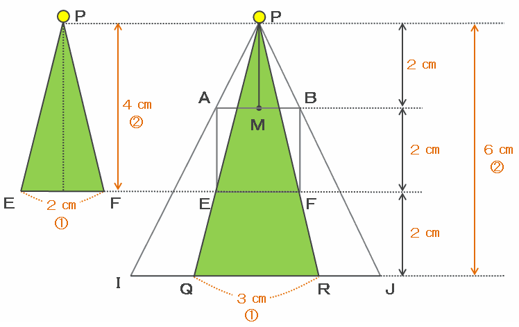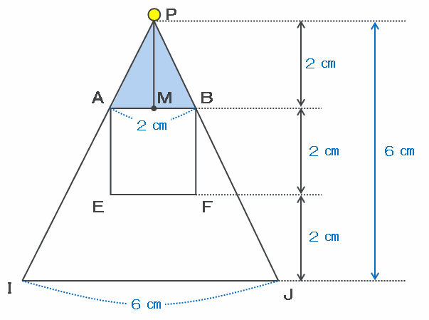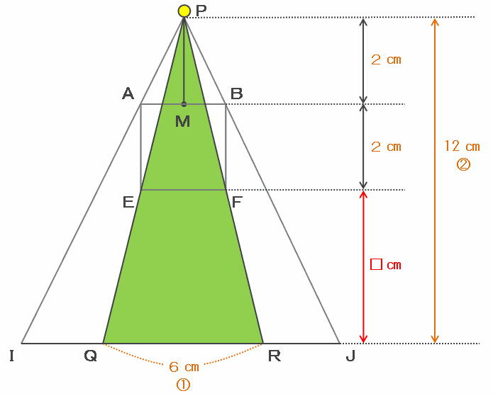 このとき、下の図の三角形PIJは三角形PABと相似なので、底辺IJの長さは高さと同じく6㎝になります。