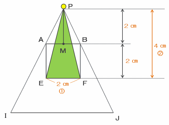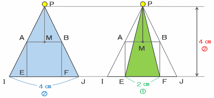 次は下の図の緑色の三角形PEFに注目してみると、この三角形は底辺EFが2㎝、そして高さが2+2=4㎝なので、底辺は高さの半分であることが分かります。
