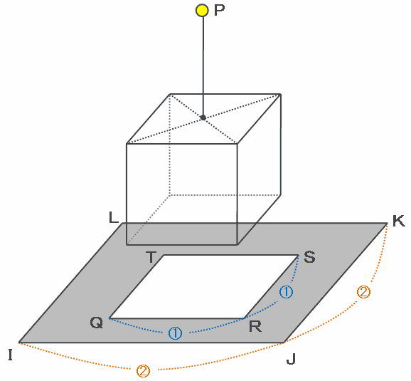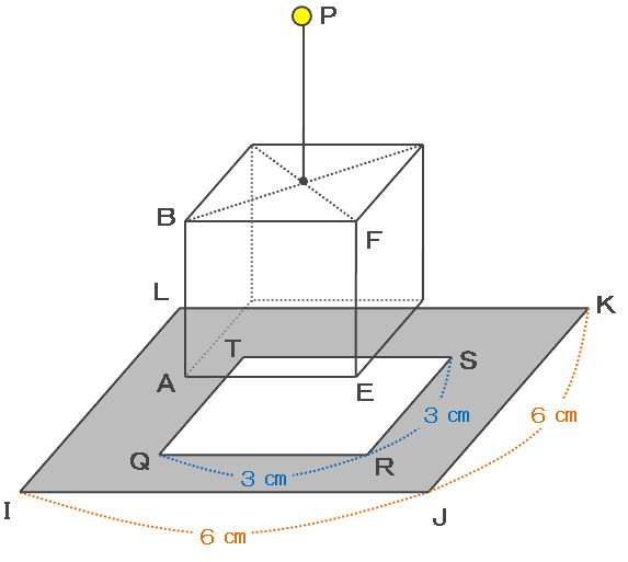 つまり、次の図の正方形IJKLは1辺の長さが6㎝、そして正方形QRSTは1辺の長さが3㎝なので、床にできる影の面積は6×6-3×3=27㎠になります。
