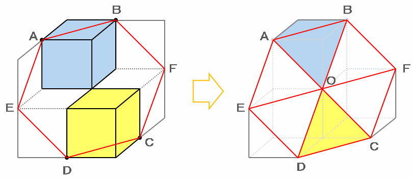 このとき、切断面の上にある正三角形ABOは青い立方体を、そして下にある正三角形ODCは黄色い立方体を切断しているので、下の図のように青と黄色の三角形がひとつずつできます。