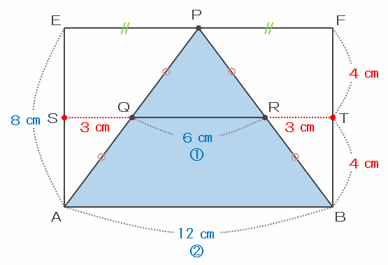 また、上の図のように点Qから左へ直線をのばしたときの辺EAとの交点をS、点Rから右へ直線をのばしたときの辺EAとの交点をTとすると、辺SQとRTの長さはどちらも(12-6)÷2=3㎝になります。