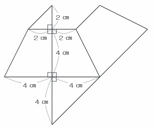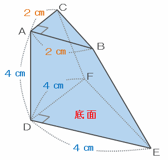 この立体の底面にあるDEFは1辺4㎝の直角二等辺三角形、真上にあるABCは1辺2㎝の直角二等辺三角形なので、三角形ABCとDEFは相似です。