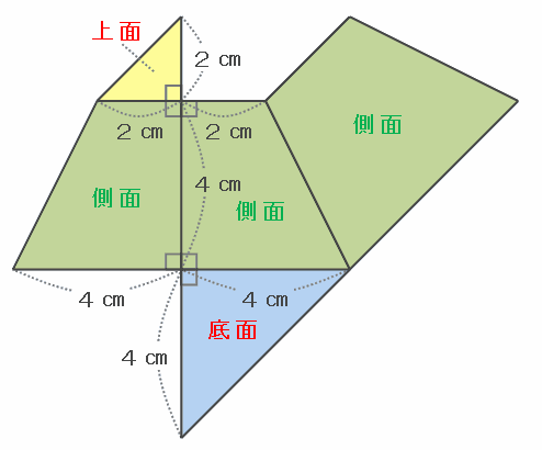 次の図のように、青い直角二等辺三角形が底面、黄色い直角二等辺三角形が真上の面、そして残りの3つの台形が側面となるように展開図を折り曲げて立体を作ります。