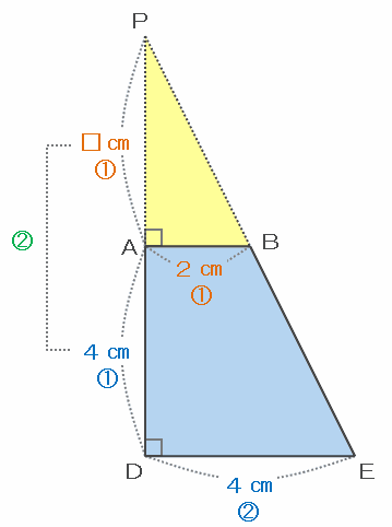 この図の三角形PABとPDEは内角がすべて等しいので相似であり、対応する辺の長さの比はAB:DE=2㎝:4㎝=1:2です。