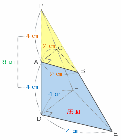 つまり次の図のように、三角すいPDEFの高さにあたるPDは4+4=8㎝となることが分かったので、三角すいPDEFの体積は4×4÷2×8÷3=3分の64㎤です。