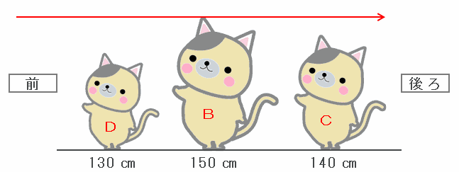 3人の中でいちばん身長の高いBさんはどの位置にいても見えるので、前から見たときにDさんも見えるようにするには、次の図のようにDさんをBさんよりも前に立たせればOKです。