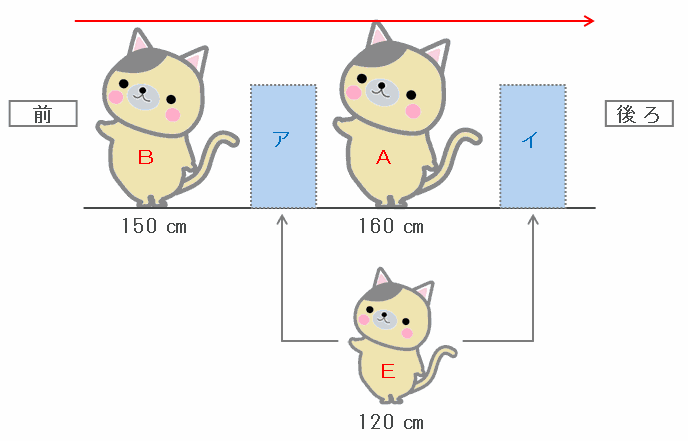 また、Eさんは3人の中でいちばん身長が低いので、次の図のア(BさんとAさんの間)またはイ(Aさんの後ろ)に立たせれば、前から見えることはありません。