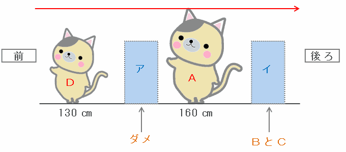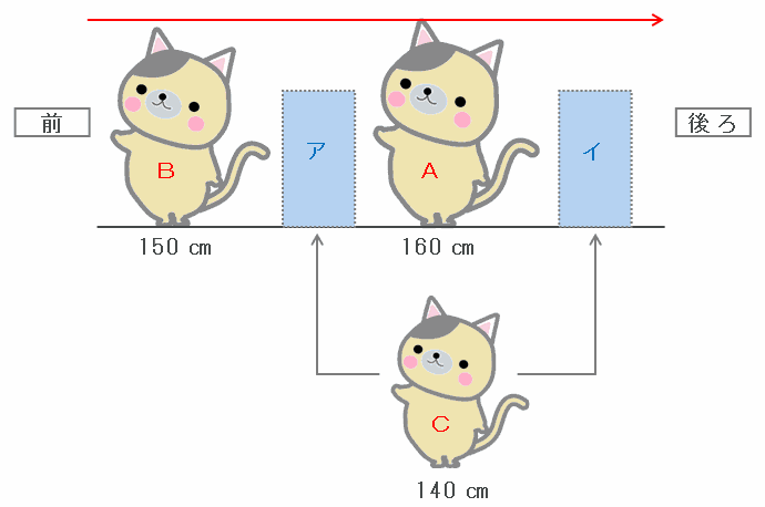 Cさんは3人の中でいちばん身長が低いので、次の図のア(BさんとAさんの間)またはイ(Aさんの後ろ)に立たせれば、前から見えることはありません。