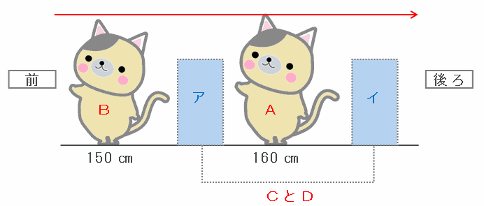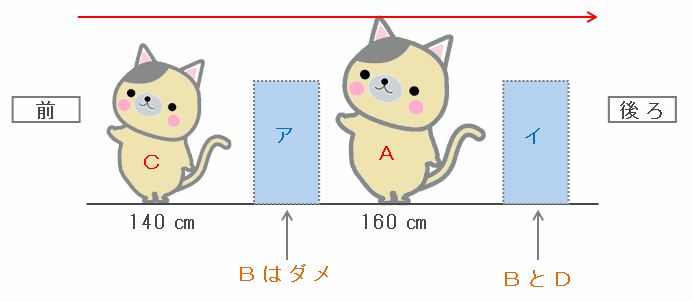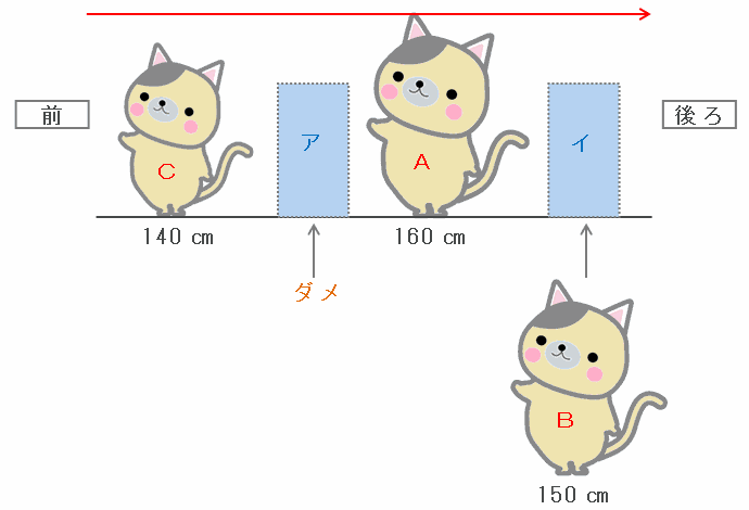 BさんはCさんよりも身長が高いので、次の図のア(CさんとAさんの間)の位置にBさんを立たせると、前から見たときに「C-B-A」の順で3人とも見えてしまいます。