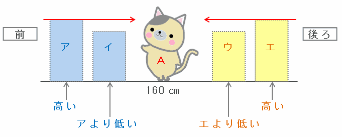 ・後ろから→図のエにいる人がウより高いので、後ろから見るとエにいる人とAさんが見える。