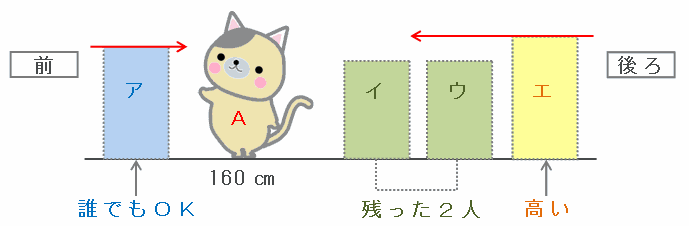 もし上の図のアにDさんが立つのであれば、イの位置に立てるのはEさんだけ、そして残った2人のうちで身長の高いBさんがエ、低いCさんがウに立ちます。