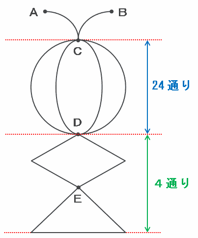 ここまでの流れをまとめてみると、下の図のようにCD間の進み方は24通り、そしてDより下の進み方は4通りなので、一筆書きの方法は全部で24×4=96通りになります。
