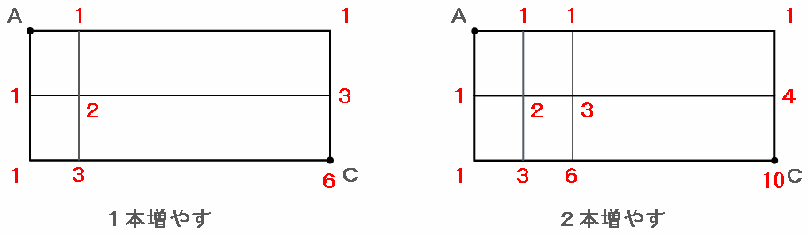 ・たての道を2本増やす→たての道は両側もふくめて全部で4本→行き方は10通り