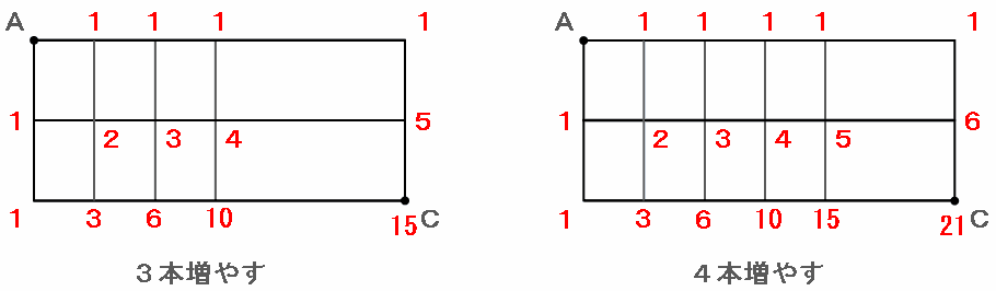 ・たての道を3本増やす→たての道は両側もふくめて全部で5本→行き方は15通り