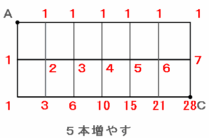 上の図から、たての道を5本増やしたときの行き方は全部で28通りになります。