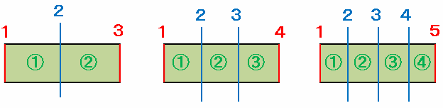 次の図を見れば分かるように、たての道が両側をふくめて3本のときは土地が2か所、4本のときは3か所、そして5本のときは4か所となっていることから、両側をふくめたたての道が□本あるとき、「□-1=上段にある土地の数」という式ができます。