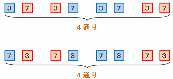 また、2つの数字を入れ替えて「7×3」とした場合にも同じように4通りできるので、異なる2つの数を使う場合の組み合わせは、全部で4×2=8通りできることが分かります。