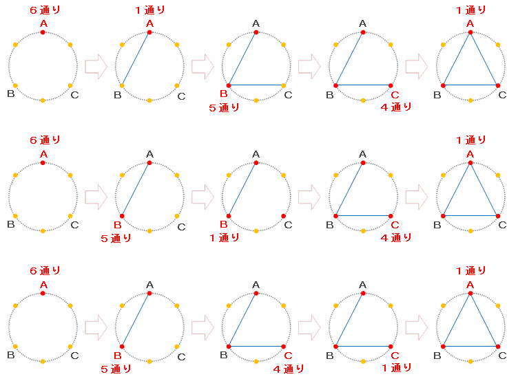 上の図の点A(1回目)の選び方は1から6の6通り、点B(2回目)の選び方はA以外の目ならOKなので5通り、そして点C(3回目)の選び方はAとB以外の目ならOKなので4通りあります。
