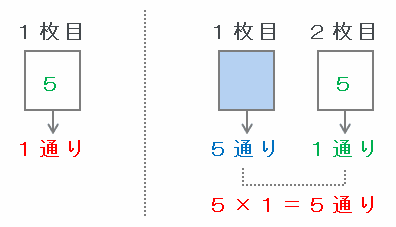 「5」が1枚目に出た場合はどう考えても1通りしかありませんが、「5」が2枚目に出た場合の組み合わせは、