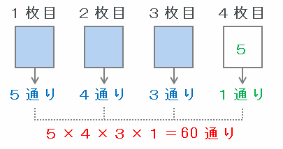 となることから、5×4×3×1=60通りできます(次の図参照)。