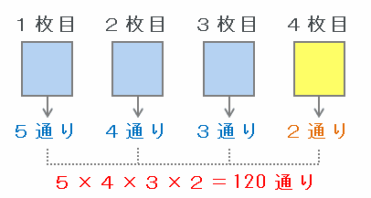 となることから、5×4×3×2=120通りできます(次の図参照)。