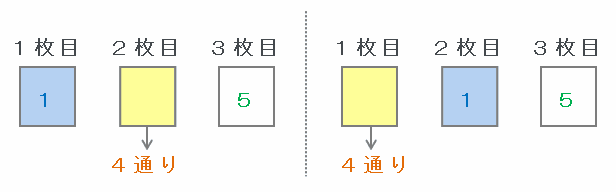 また、2枚目に「1」、3枚目を「5」を使った場合でも同じく4通りできるので、1枚目または2枚目が「1」で3枚目が「5」の場合は全部で4×2=8通りあります。