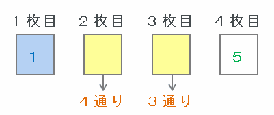 ・2枚目→1枚目で選ばなかった4枚からどれか1枚を選ぶので4通り