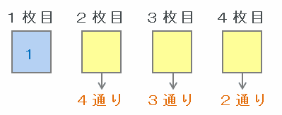 ・2枚目→「2」、「3」、「4」、「6」から1枚をあてはめるので4通り