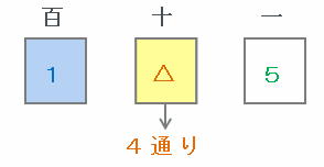 次の図のように、仮に百の位を「1」、一の位を「5」とすると、十の位には「2」、「3」、「4」、「6」のどれかがあてはまるので、3けたの数「1△5」は4通りできます。