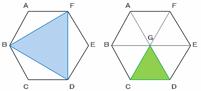 正六角形の外側の辺を使わない場合、次の図のBDFのような大きい正三角形ができます。また、正六角形の中心である点Gを使う場合、下の図のGCDのような小さい正三角形ができます。