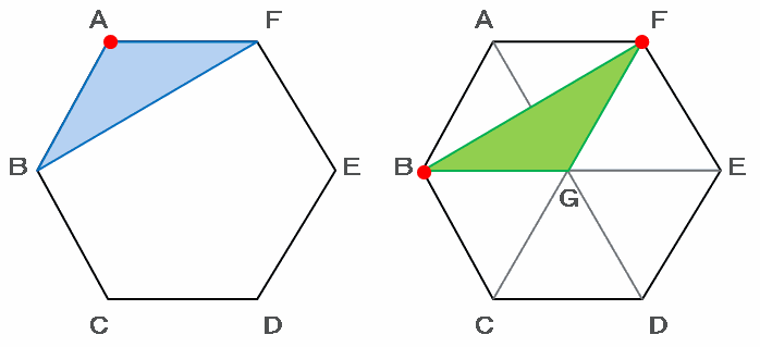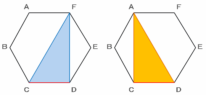 正六角形の2辺を使う場合、次の図のABFのような二等辺三角形ができます。また、正六角形の1辺を使う場合はCDFのような直角三角形になります。
