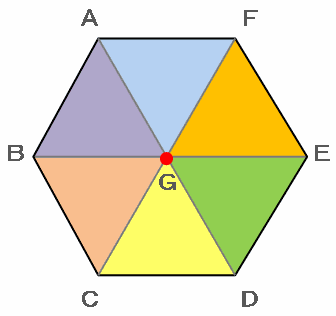 正六角形の中心Gを必ず使って三角形を作るとき、次の図のように小さい正三角形が全部で6個できます。