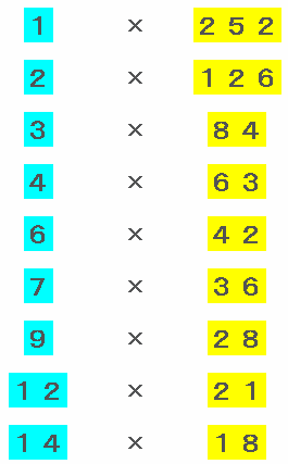 かけ算の答えが252になる組み合わせを書き出してみると、次の図のようになります。