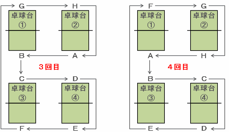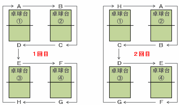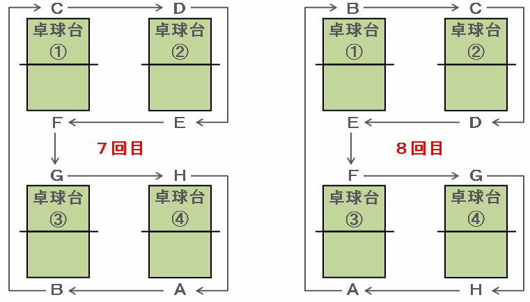 ある町の公民館には下の図のように4つの卓球台があります。A、B、C、D、E、F、G、Hの8人が対戦を1回するごとに矢印の向きに1つずつ位置を移動しながら対戦をくり返します。最初に8人が図の位置で1回目の対戦を始めたとき、次の問いに答えなさい。