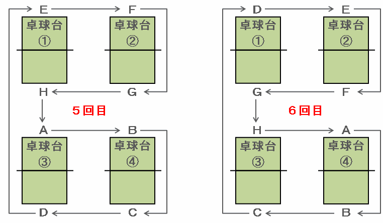 9回目の対戦は1回目とまったく同じ図になるので、Aの対戦相手はひたすら「D→B→H→F」のくり返しになります。
