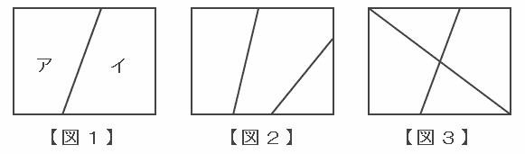 次の図のように、長方形の内部に2本の直線が引いてあるときは、長方形の内部がア~エの4か所に分かれています。