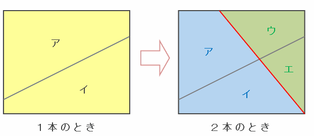 そこへ直線をもう1本引いてみると、アとイがそれぞれ分割されてウとエができるので、「2本目の直線によって、長方形の内部で分かれた部分が2つ増える」ことが分かります。