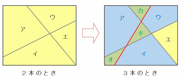 そこへ直線をもう1本引いてみると、「ア・イ・ウ」がそれぞれ分割されて「オ・カ・キ」ができるので、「3本目の直線によって、長方形の内部で分かれた部分が3つ増える」ことが分かります。