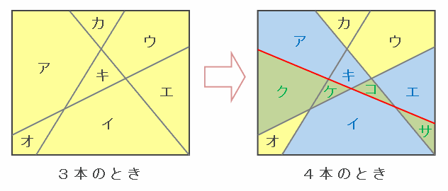 そこへ直線をもう1本引いてみると、「ア・キ・イ・エ」がそれぞれ分割されて「ク・ケ・コ・サ」ができるので、「4本目の直線によって、長方形の内部で分かれた部分が4つ増える」ことが分かります。
