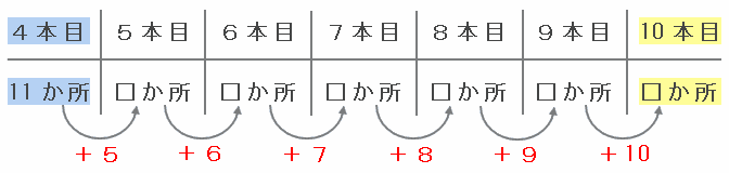 以上から、長方形の内部に10本目の直線を引いたとき、長方形の内部は11+5+6+7+8+9+10=56(か所)に分かれています。