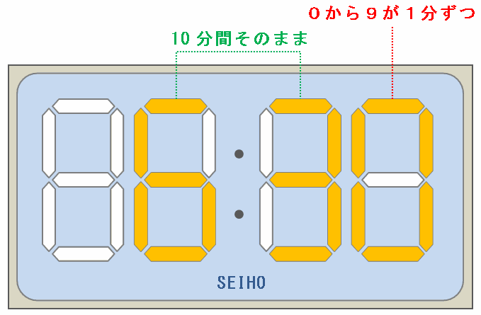 ※ 00分から09分が終わるまで、十の位には「0」が表示され続ける。