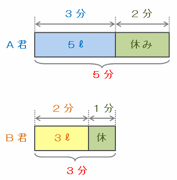 また、B君は「3リットルの水をくみ上げる2分間」と「1分間の休み」を繰り返すので、2+1=3分間を1セットにします。