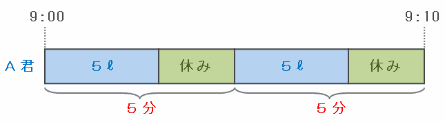最初の10分間はA君だけが作業をするのですが、10÷5=2なので、A君は次の図のように水を5リットルずつ2回くみ上げます。
