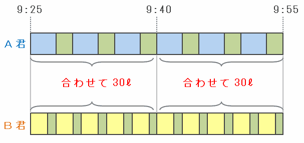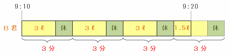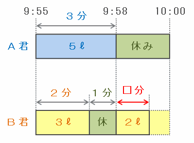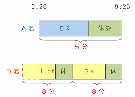 また、9時58分からはA君が休みに入るので、最後の2リットルはB君だけがくみ上げることになります。