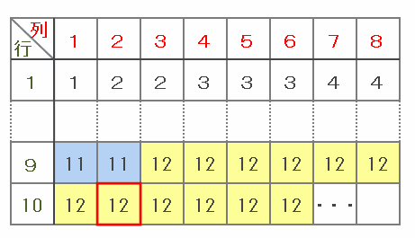 その後は次の図のように12が12個連続して並ぶので、10行2列目には8個目の12があてはまります。