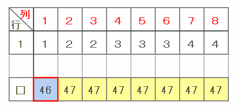 つまり、この行には2種類の数字が混ざっており、8個が全部46だと合計が7足りないので、次の図のように1列目は46、そして2列目から8列目までの7個の数字はすべて46+1=47にすれば、合計がちょうど375になります。