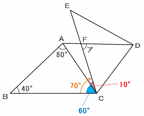 三角形DECは、三角形ABCの頂点Cを中心にして、下の図のように70度回転したものです。図の角アの大きさは何度ですか。