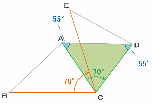したがって、上の図の角CADと角CDAの大きさは、どちらも(180-70)÷2=55度になります。